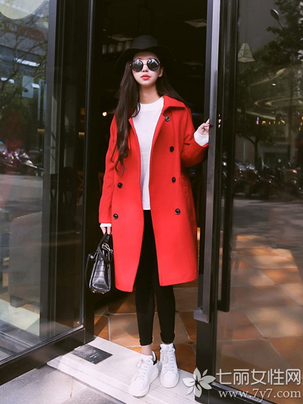 时尚看点:红色毛呢大衣搭配休闲鞋,无论是逛街还是游玩,都会多谢轻松舒适感,而且还有着减龄的好处。在配饰的选择上,宽檐帽一直都是达人凹造型的利器,一定不要错过哦!