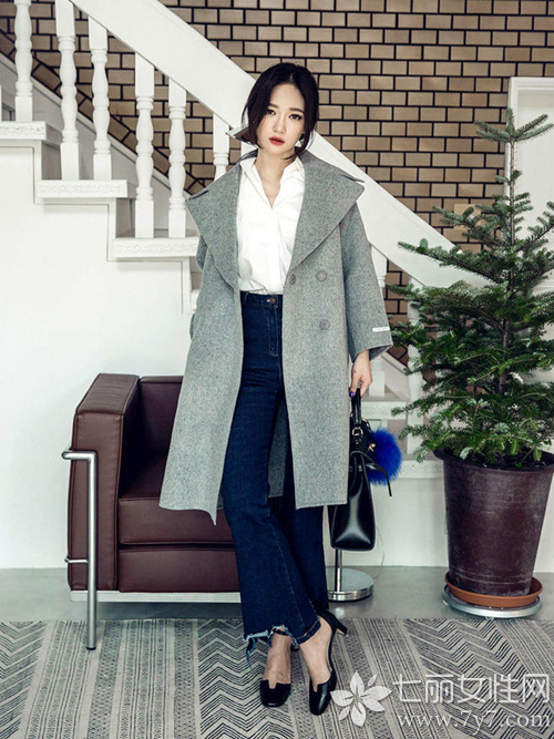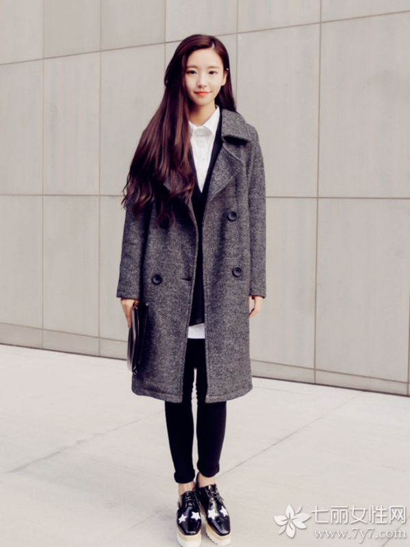 小编点评:长款的灰色毛呢大衣对于腿短MM来说,会遇到搭配上的尴尬,除了配高跟鞋外,舒适又增高的松糕鞋也非常适合,而且厚底的别样感,还能带来搭配的亮点。