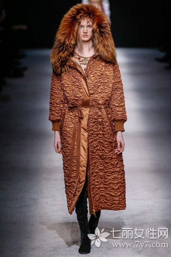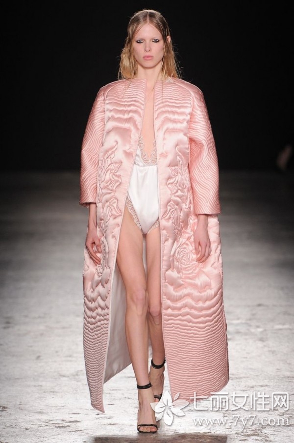 今年秀场上推出的棉衣大多以面料革新,与款式大气的中长款棉衣为主,看这件红色的粉红刺绣棉衣,被做成风衣的款式,显得大气又雍容高贵。