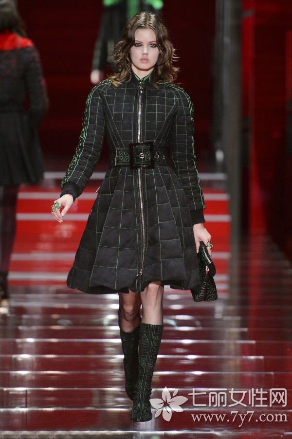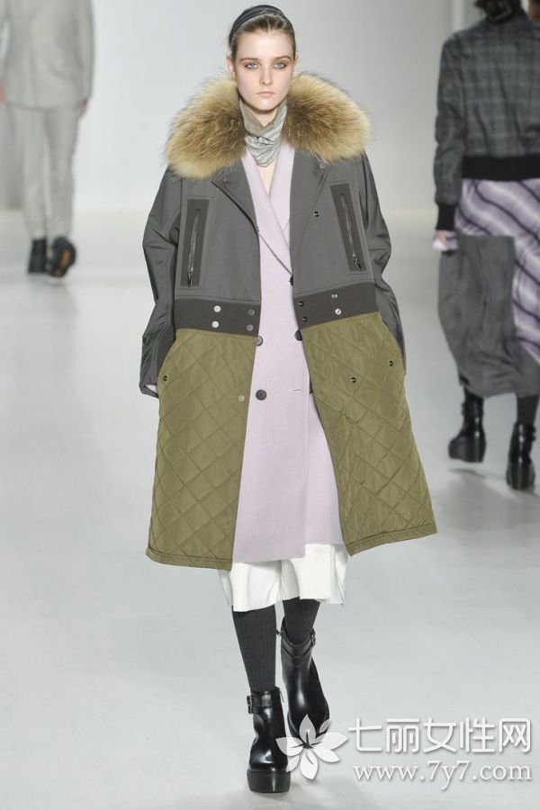 军绿风的元素也被引进到棉衣的设计当中。看图中军绿与深灰拼接款式,与黑亮的真皮靴搭配,显得率性又有范,毛绒的领口装饰也增添了几分雍容霸气。