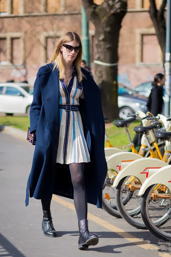 黑色大衣+条纹连衣裙+短靴+链条包