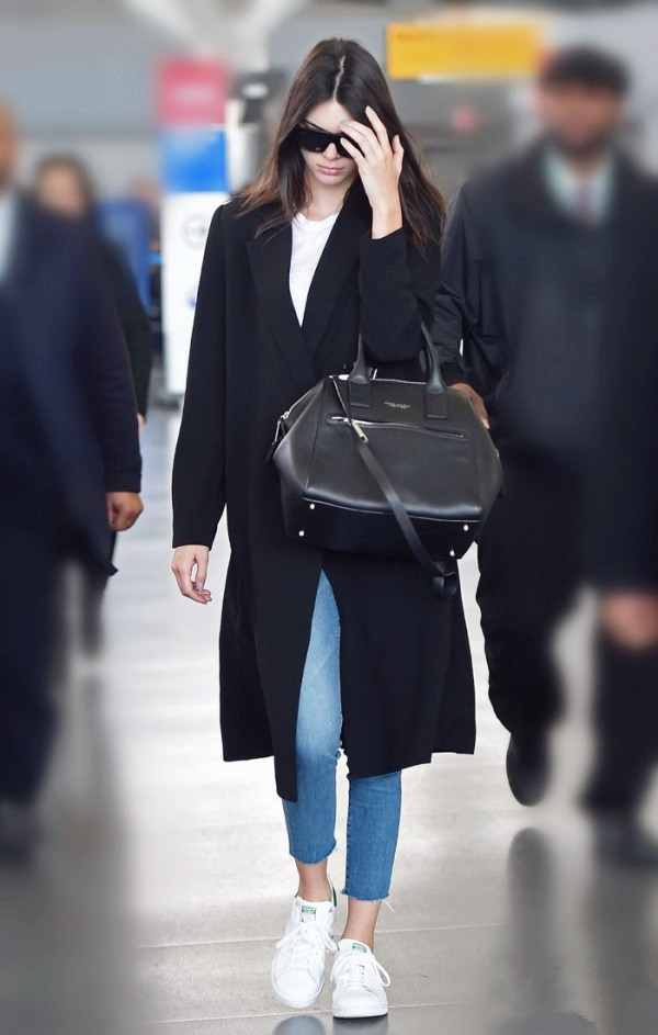 黑色大衣+白T+九分牛仔裤+运动鞋+手提包