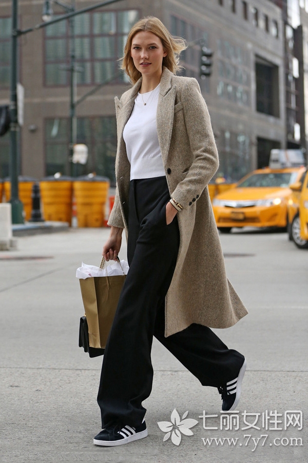 时尚看点:利用风衣的大廓形来营造简约休闲风,可以像图中达人那样搭配阔腿裤。首先阔腿裤是当前时髦度较高的款式,款型宽松舒适,与风衣外套的廓形对比下,显得大气又前卫,绝对会是街道上独特的风景。