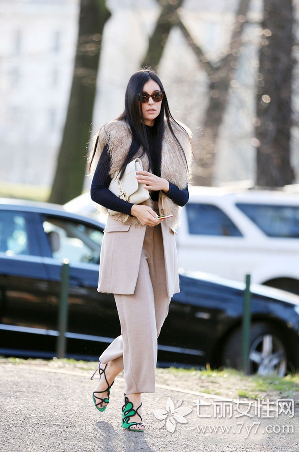 时尚看点:皮草背心下搭阔腿裤,打造简约风格搭配,配上气质的高跟鞋,很有女性魅力。