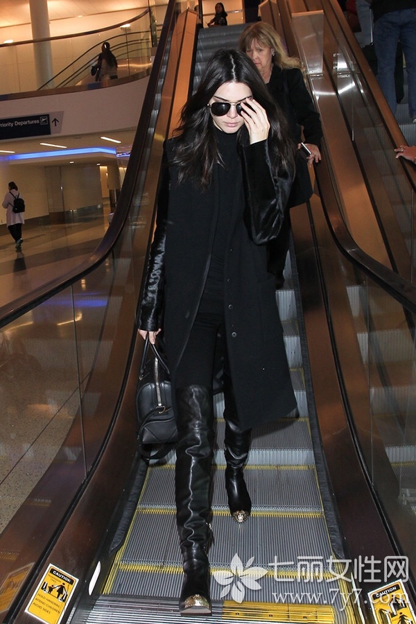 Look1:黑色拼接风衣+黑色高领线衫+黑色legging+金饰过膝靴