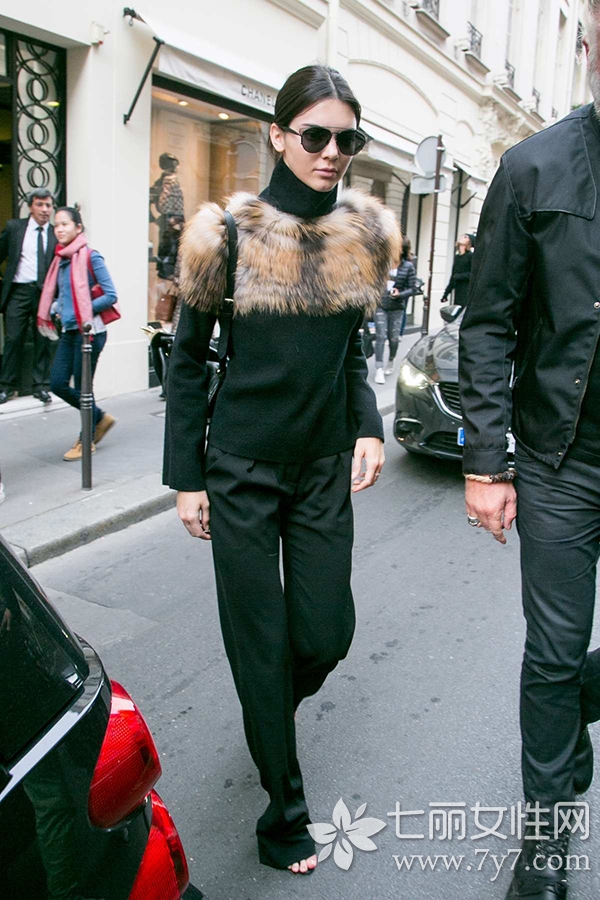 Look2:黑色皮草饰毛衣+黑色阔腿裤+一字带高跟