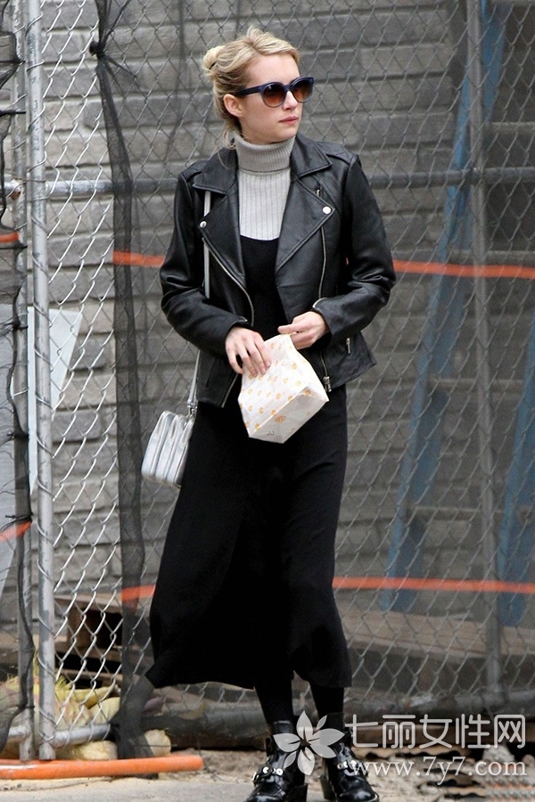 Look1:黑色皮衣+灰色高领毛衣+黑色背心连身裙+黑色皮鞋