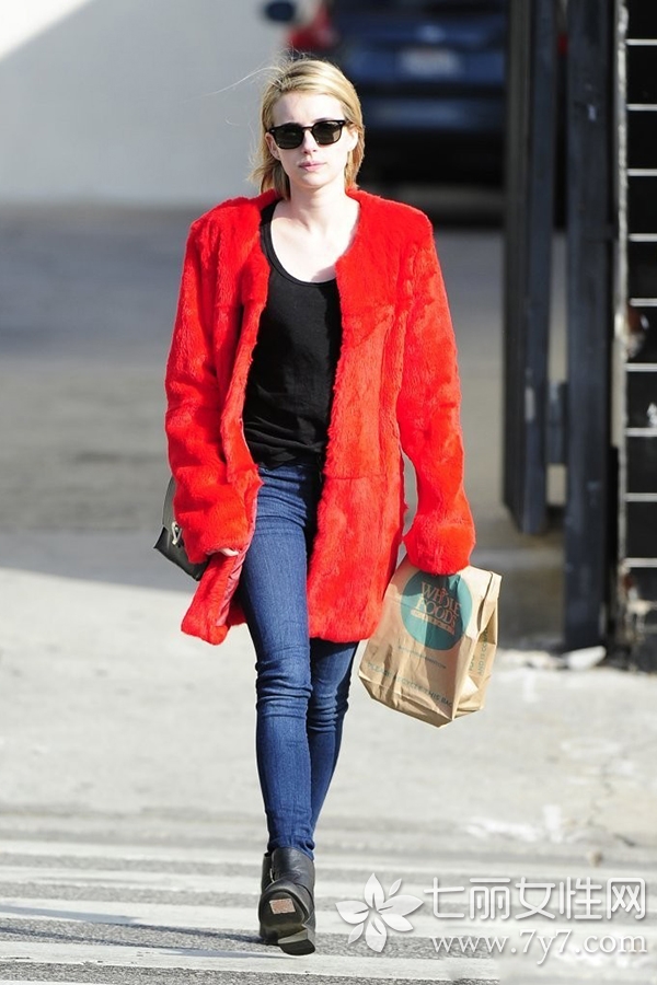 艾玛相对来説是很喜欢动物系的衣服,这样一件红色的外套能给你良好的气色,但是这一穿搭只适合肤色偏白的妹子们。