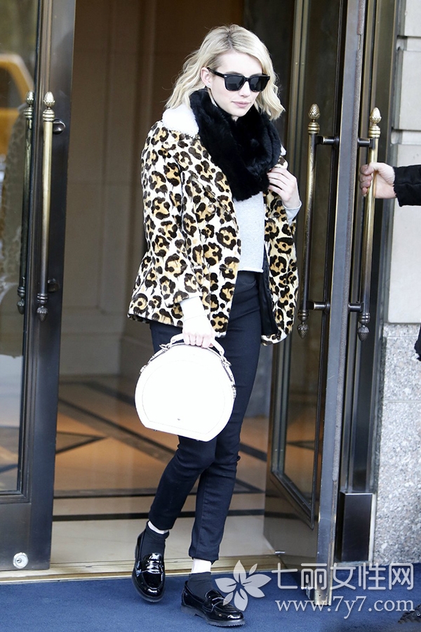 这件豹纹的棉服艾玛也是穿了好多年,简洁的搭配配上动物纹的棉衣显得野性也接地气。值得一看的是马卡龙色的圆形手包,给穿搭加入了可爱的元素。