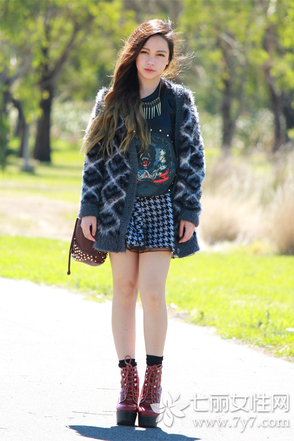 毛绒外套+印花卫衣+千鸟纹短裙+酒红色高跟靴
