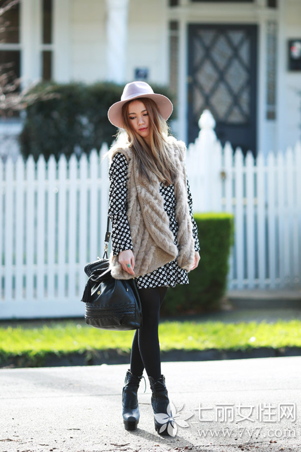 穿衣服要学会注重比例,上重下轻才能打造完美的视觉效果。毛绒背心会遮盖掉你的身材,所以这个时候选择一件高腰的连衣裙就变得至关重要。再配上一个宽边帽,让人们的目光轻易的上移。
