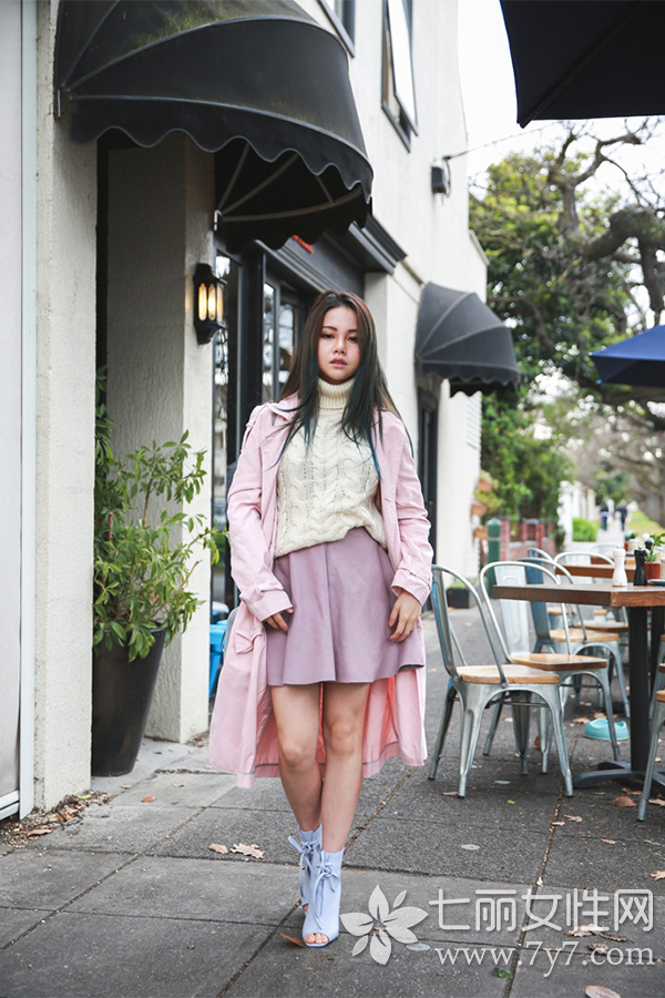 粉色风衣+白色高领毛衣+香芋紫A字裙+浅蓝色鱼嘴高跟