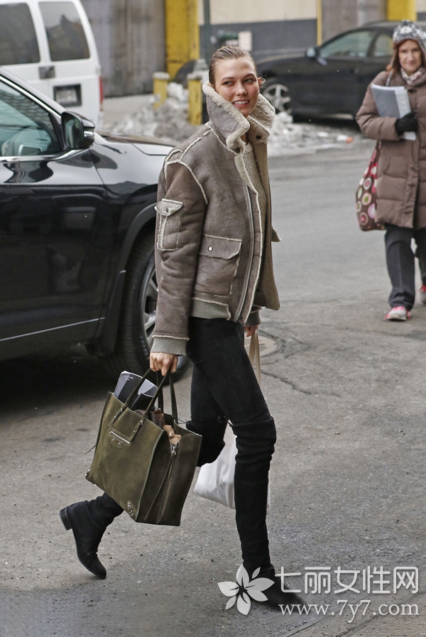时尚看点:毛领皮衣搭配铅笔裤会显得更整洁干练,原本的厚重感也会被贴身的铅笔裤悄悄转移走,搭配上复古帅气的麂皮靴,出街倍轻松自由,还让女生显得别样有范。