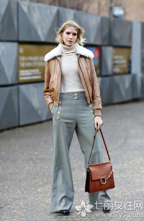 LOOK2 毛领皮衣+高领毛衣+高腰阔腿裤+复古色单肩包