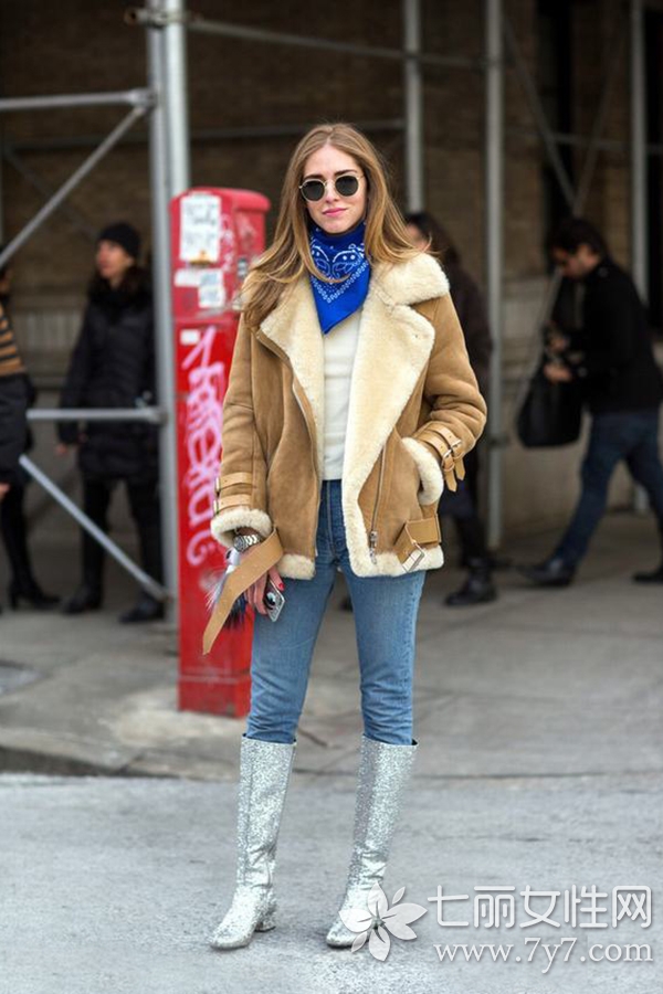 搭配示范:驼色羊羔绒外套+白色内搭+牛仔裤+蓝色领巾+银色高筒靴