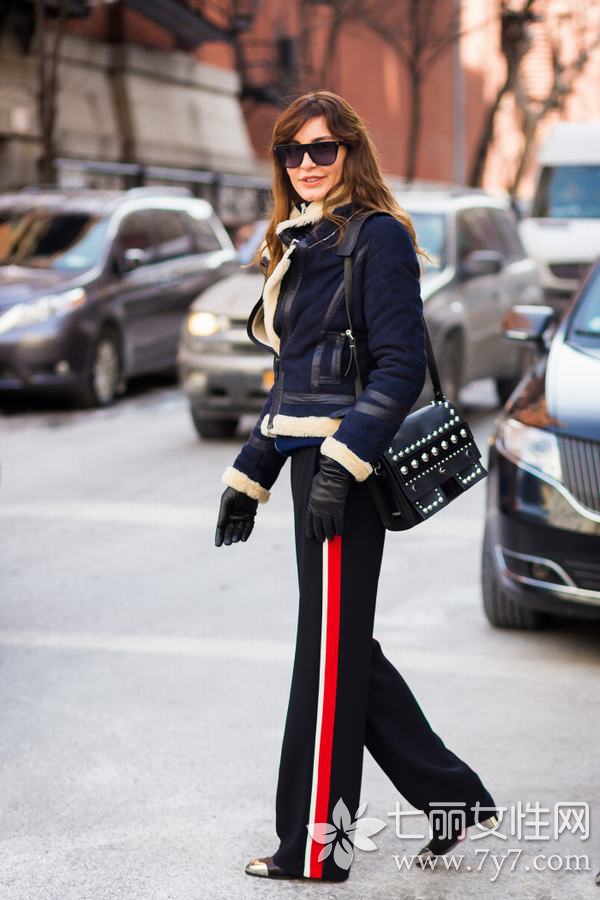 搭配示范:深蓝色羊羔绒外套+黑色西装裤+银饰高跟靴+铆钉方包