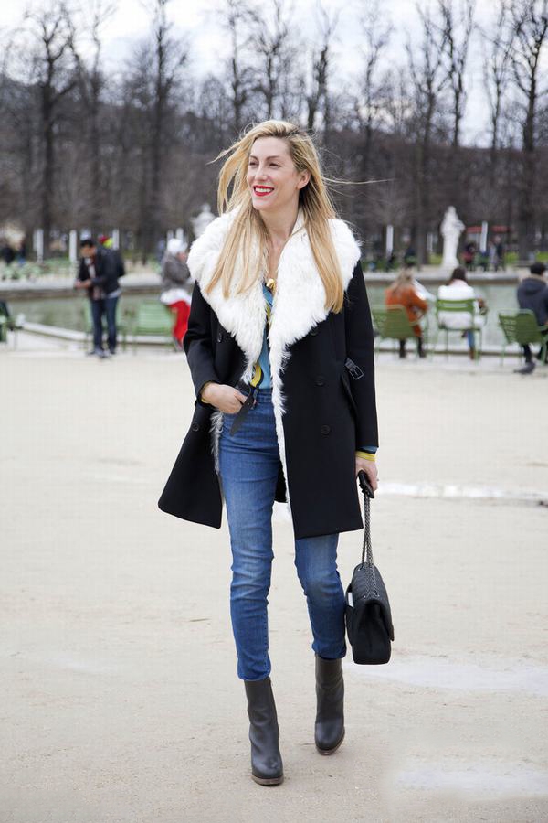 搭配示范:黑色羊羔绒外套+蓝色印花内搭+高腰牛仔裤+黑色踝靴