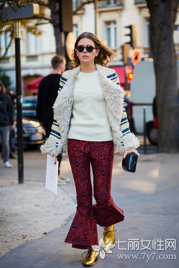 何穗最新街拍,灰色毛衣+墨绿色光泽感半裙,文艺慵懒,少女感十足。马海毛毛衣来自H&M,手提包和粉色毛拖鞋均来自Gucci,半裙来自Tibi 2016