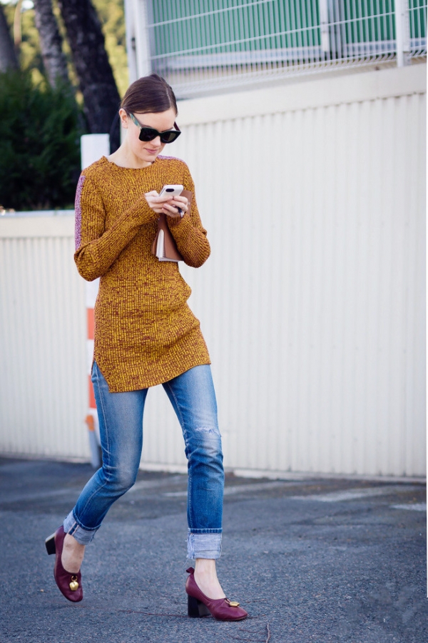 贴身中长款毛衣搭配牛仔裤显得十分雅致,裤脚卷起更加有范哦。复古酒红色粗跟鞋与姜黄色相呼应,尽显70年代复古风情。