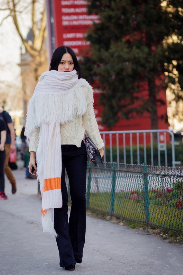 Style 3:短毛衣+喇叭裤+高跟鞋+围巾