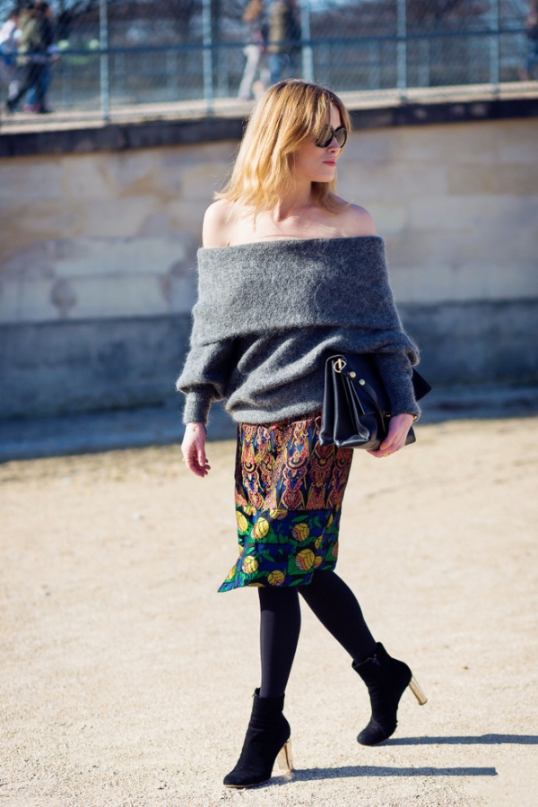 Style 6:露肩针织毛衣+印花短裙+短靴+手拿包
