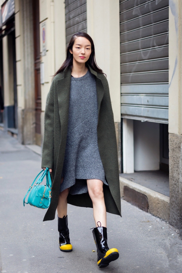 中国超模孙菲菲衣品一直不错,长款灰色针织毛衣搭配时髦指数爆棚的雨靴,简单又个性。外搭一件墨绿色长款大衣,极简的线条却显得十分大方耐看。