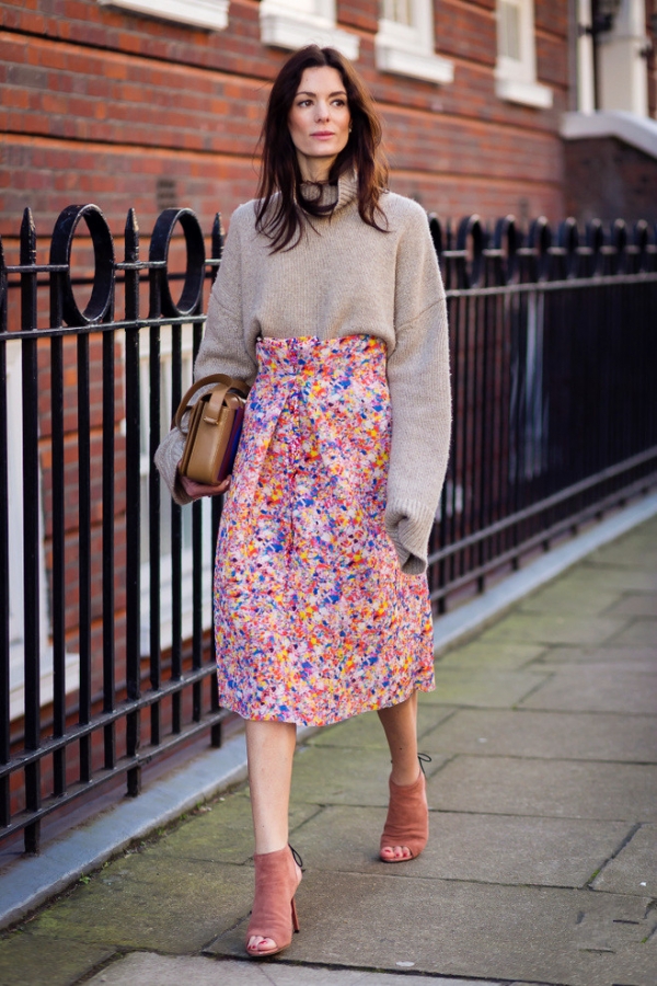 高领针织毛衣搭配高腰碎花裙也是十分美艳的搭配,下搭裸粉色露趾鞋,呼应伞裙色彩又十分柔美,让秋冬也不再显得寒冷。