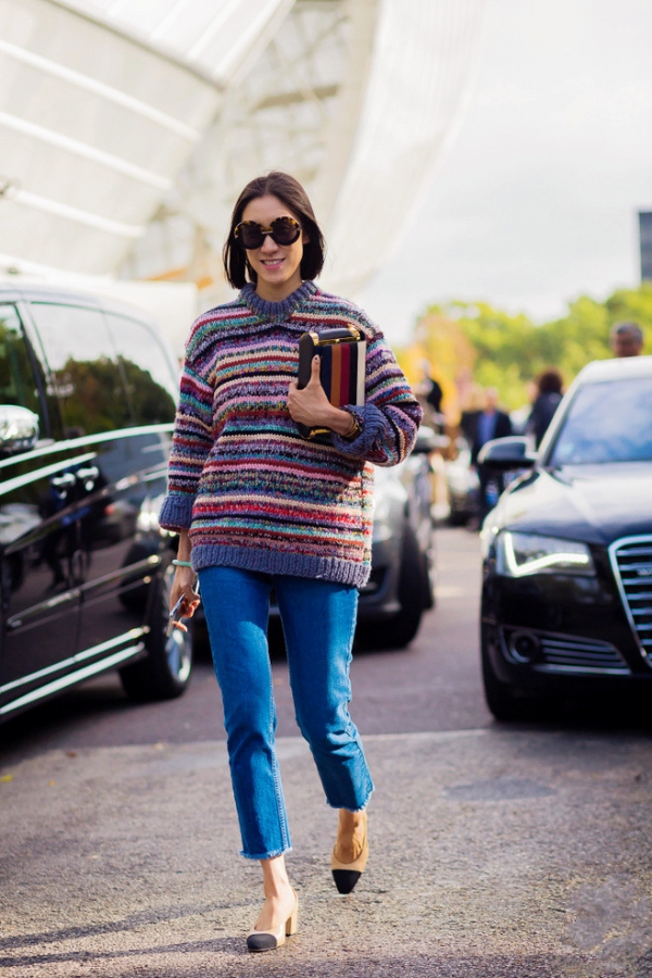 Style 10:拼色毛衣+九分牛仔裤+尖头鞋+手拿包