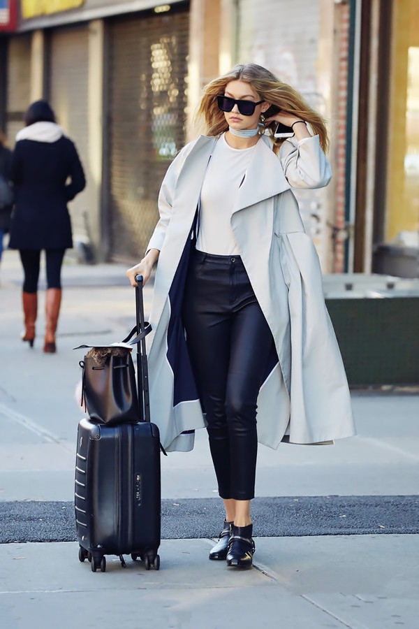 或者像当红胖模Gigi Hadid这样,选择简约的黑白灰搭出强大气场。纯色白T+高腰九分皮裤,极简又强势。将上衣扎进裤头轻松提升腰线,并且大衣也能遮掉部分腿部肌肤,让双腿更显修长。只要会穿,微胖都不算事儿~