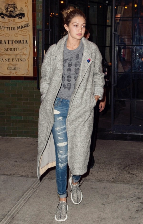 灰色大衣+灰T+磨破牛仔裤+运动鞋