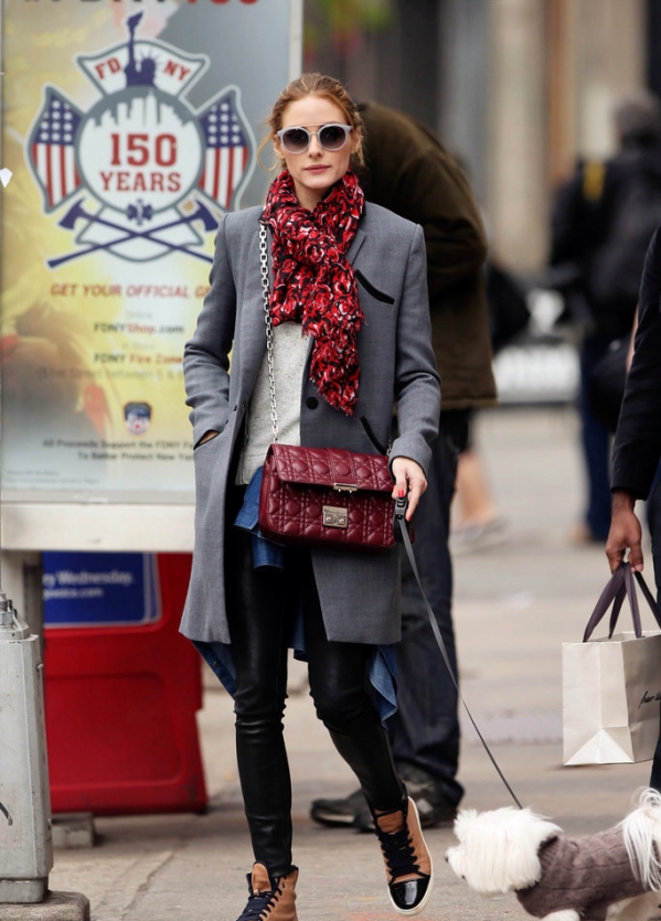 灰色大衣+浅灰色打底+皮裤+休闲鞋+链条包