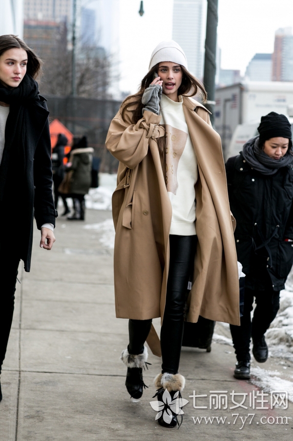 时尚看点:如今女生穿大衣都喜爱敞开穿,这样会比较有型,但在保证时尚度的情况下,保暖工作还是要做到位的。比如图中针织衫和皮裤的组合,就会让你的冬季出街温暖有型,像针织帽,毛绒靴这类单品,也是大衣造型的最佳选择哦!
