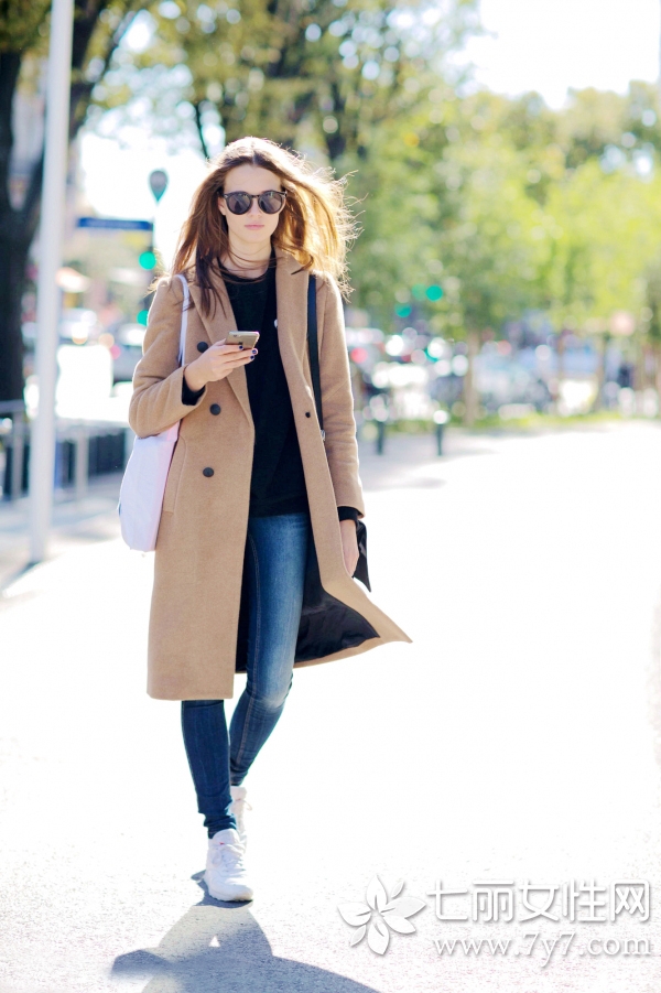 LOOK6 驼色大衣+牛仔裤+白色运动鞋