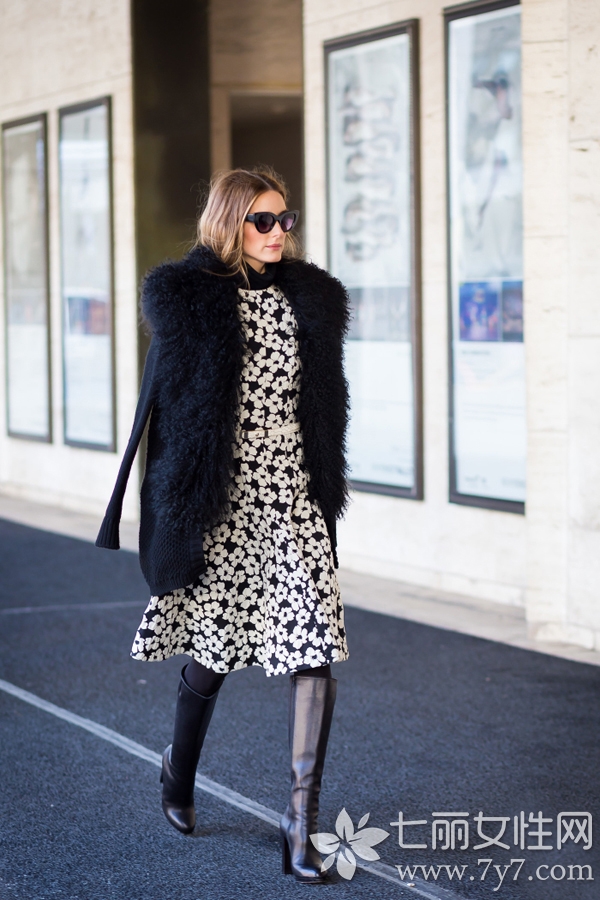 黑白碎花长裙带来视觉冲击力,与黑色皮草大衣搭配,显得优雅又吸睛,再配上黑色皮长靴,尽显十足的名媛范。