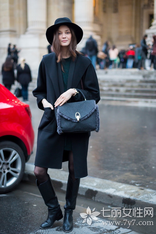 黑色大衣内搭修身裙装营造出层次感,利用宽檐帽和手提包配饰丰富整体看点,依然很有格调。