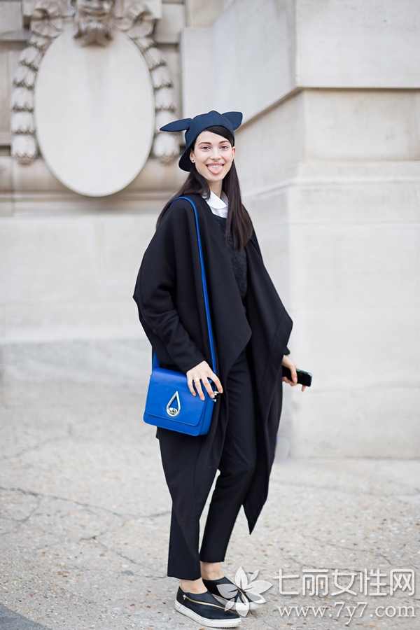 白衬衫与针织组成内外搭配,是十分流行的方法,露出的一部分领口让颈部多了一丝轻爽感,用亮眼时髦的蓝色单肩包营造焦点,让黑色套装也显得生动活泼起来。