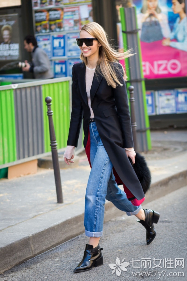 蓝色牛仔裤与黑色风衣的色彩对比,显得清新亮眼。