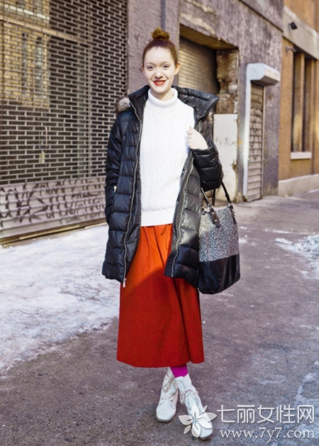 时尚看点:长款羽绒服搭配半长裙不仅看上去休闲舒适,也显得优雅大方。