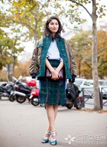 时尚看点:羽绒服除了通过时髦款式来增加看点外,合理的搭配方法也能看起来魅力大方。图中就用了高腰一字裙与衬衫的组合,通过拉长腿部,来制造身型的美感。