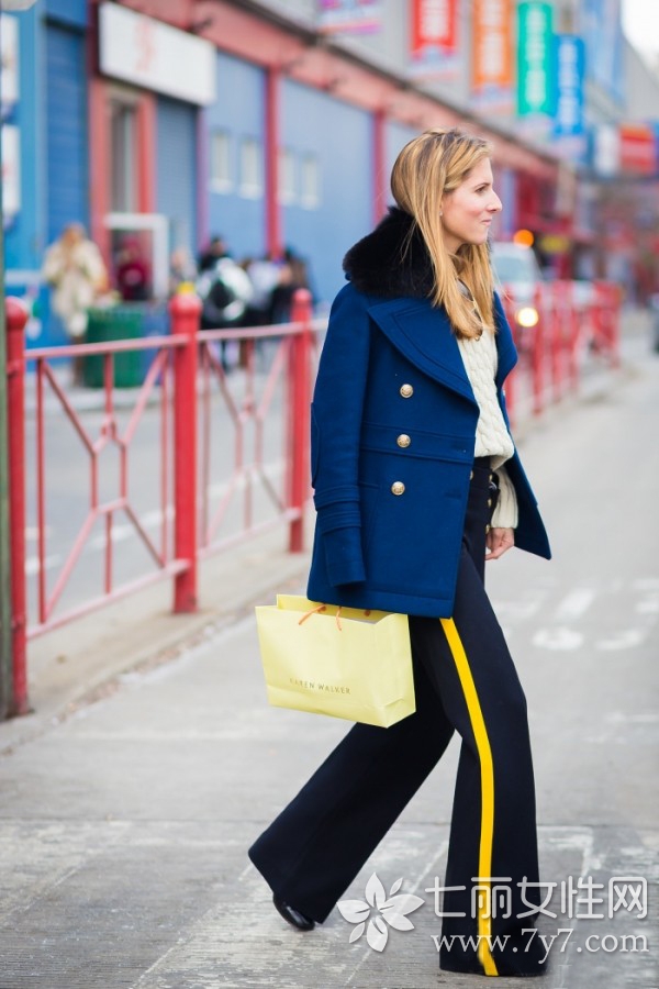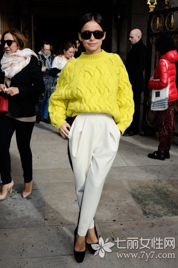 在沉闷的冬季,选择一款亮色系毛衣,会另你更具吸睛度。图中亮黄色毛衣搭配休闲运动裤,绝对比外套要来得率性大方。