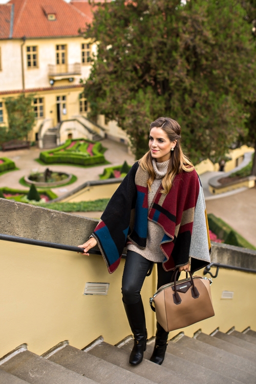 米色高领毛衣+拼色斗篷+皮裤+高跟靴