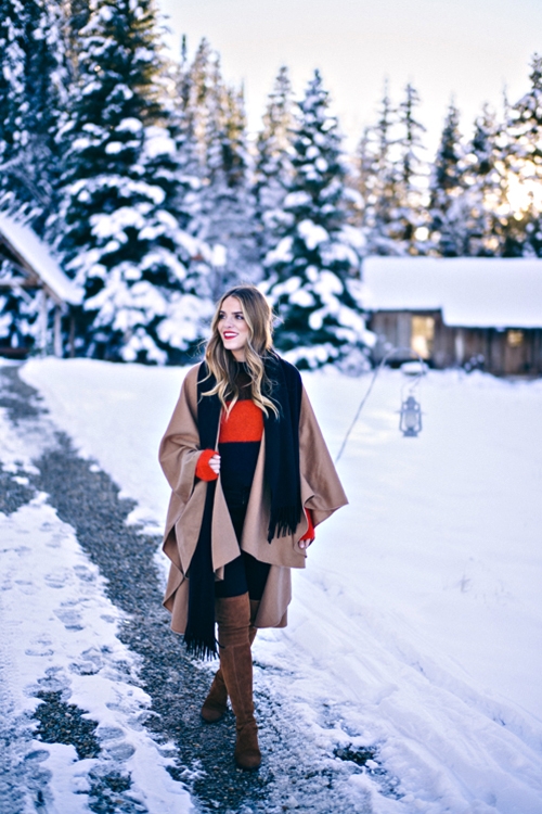 卡其色斗篷+拼色毛衣+牛仔裤+高筒靴+围巾