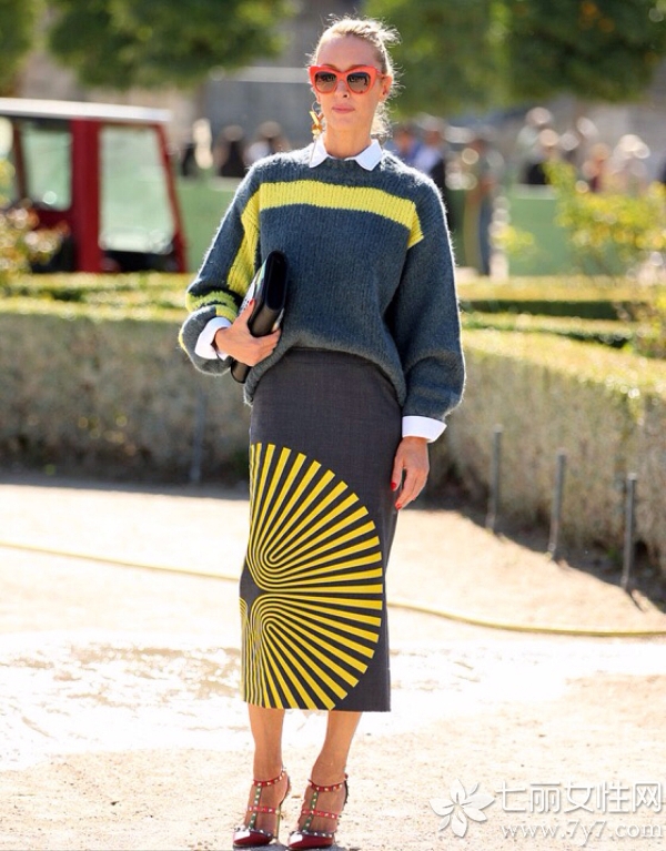 时尚看点:新颖靓丽的撞色毛衣,比较受个性潮人的欢迎,有于毛衣本身就十分有看点,当外套穿也比较能吸引眼球,但潮人们会利用精致的配饰来搭出高级感。像图中内搭白衬衫的技巧,也会看起来更自然大方。