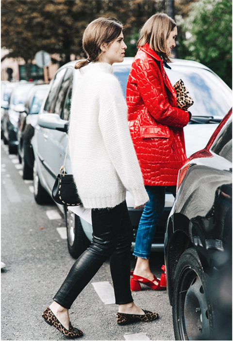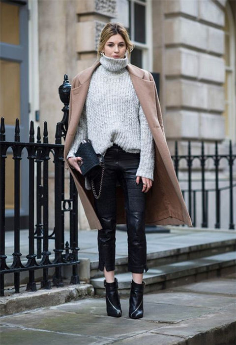 紧身皮裤与柔软毛衣的组合十分和谐,而且随意百搭,不管是oversize的大毛衣,还是今冬火爆的高领毛衣,皮裤都能轻松驾驭。