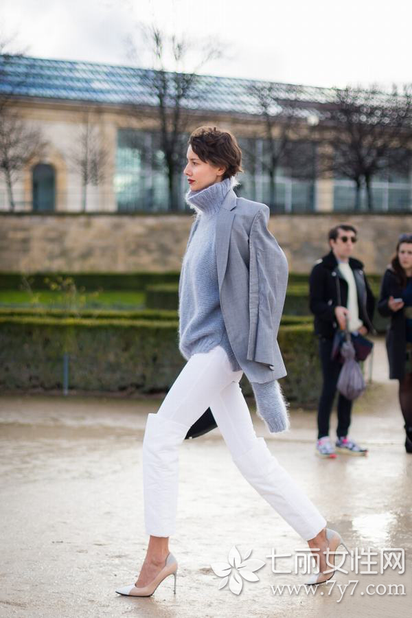 时尚看点:高领毛衣如何搭得有型,除了选择靓丽的花织毛衣外,纯色毛衣才最为经典不过时。且看图中达人,用清新淡雅的高领毛衣搭配上白色休闲裤,显得整洁清爽,给人视觉感受非常舒服,下搭裸色高跟鞋,极富名媛气质。小编再偷偷告诉你,现在外套都流行披着穿哦!