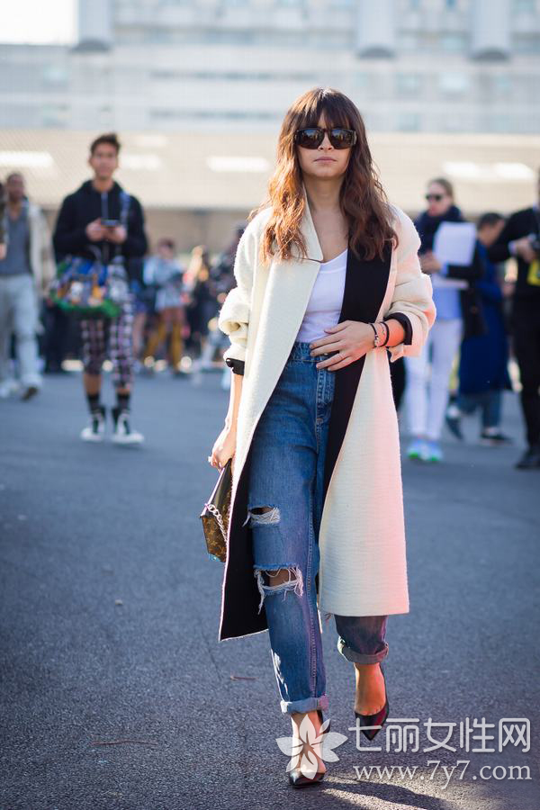 时尚看点:在搭配达人的潮流词典里,除了美感,最重要的就是个性。图中用风衣外套搭配破洞直筒裤的LOOK,虽谈不上美艳,但却十分随性大方,而休闲个性也是一种潮流。