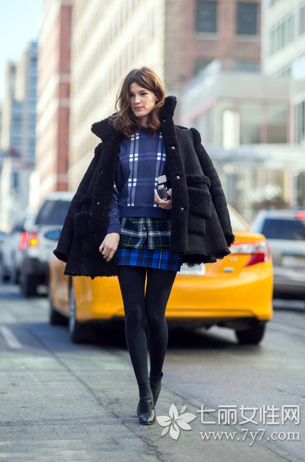 除了在面料和款式上下功夫外,抢眼的经典元素服装也会是你的选择。图中利用格纹元素服装做层次混搭,时髦而不普通,会成为你街头吸睛的重要cp哦!