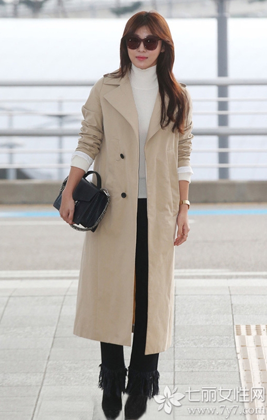 Style7 杏色风衣+高领毛衣+流苏长裤