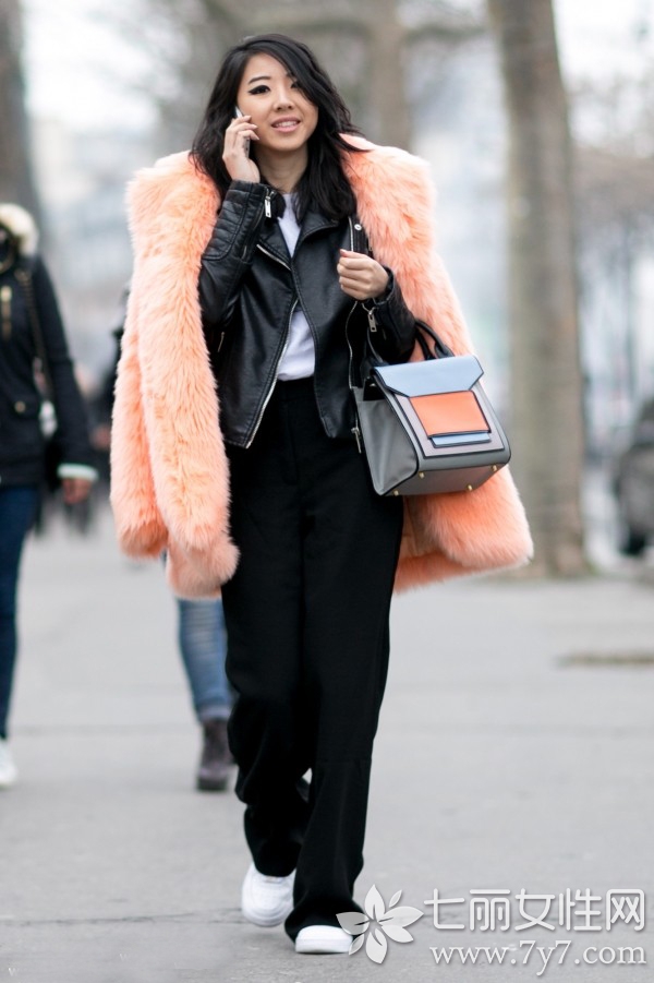 小编点评:短款的机车皮衣搭配休闲长裤,会多出几分休闲感,比较适合周末营造轻松舒适的生活。而在寒冷的冬季街头,搭配毛茸茸的皮草大衣会显得温暖又个性,箱型手提包在丰富整体看点的同时,又增添了几分现代感。