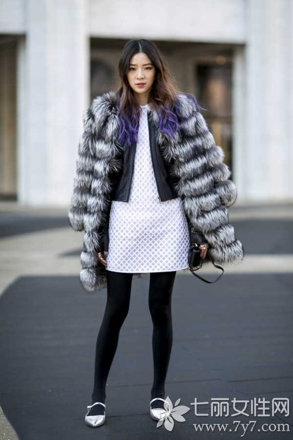 小编点评:短款皮衣与连衣裙构成的层次搭配,也是平衡身材比例的一种方式,皮衣制造出腰线,与皮草大衣的廓形对比会让身型显得更加娇小,颇具未来感的银色尖头鞋,也是女王必备哦!